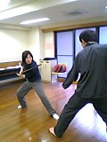 次回が三銃士っぽい舞台なので、めんめんによる殺陣講座が始まりました。まあ、なんというか、千里の道も一歩からって感じです。写真は、「気迫のかおりん、めんめんを切る」です。(三好理代) |