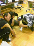 土曜日は昼から夜までの長丁場。そして日曜日には第1回目の通し稽古をしました。私事で恐縮ですが、いやぁ、緊張したな〜!上の写真は土曜日休憩中のひとコマ。稽古場の隅に不良グループ「しげ組」を発見し、カメラに収めました。(岡部誠) |