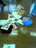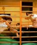 高井戸にて。今日の稽古場は児童館という事で、借りた部屋もナンと体育館でした。バスケゴールあり、平均台あり、マットあり…。あまりの懐かしさに皆、童心に帰ってしまいました。これには演出家も苦笑いするしかなかったようです。(荒井恵造) |