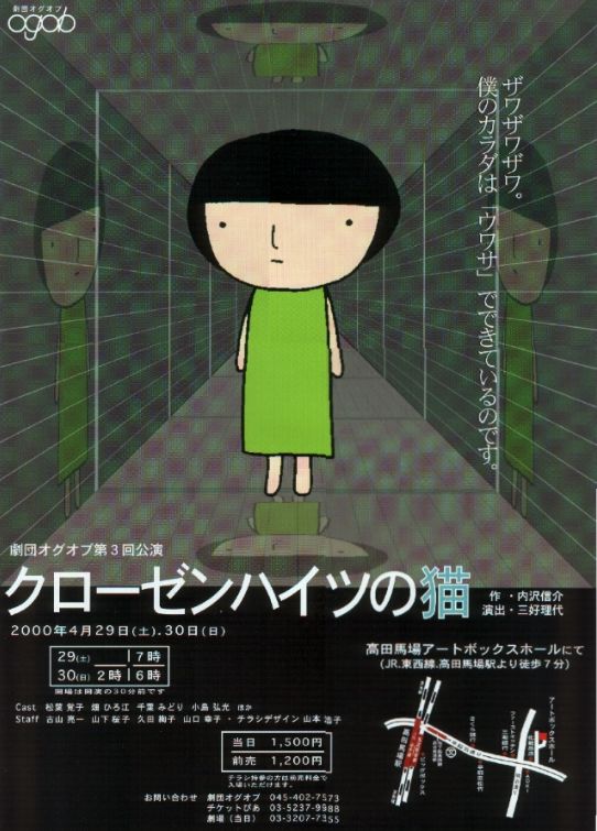 作 内沢信介 演出 三好理代 演出助手 山下桜子 舞台美術 古山亮一 舞台設計 須藤達人 照明 Horizon.M 音響 M,Amsh 衣装 松葉覚子 小道具 千葉みどり 照明操作 仁賀正典(劇工舎プリズム) 音響操作 久田絢子 チラシデザイン 山本浩子 制作 オグオブ |